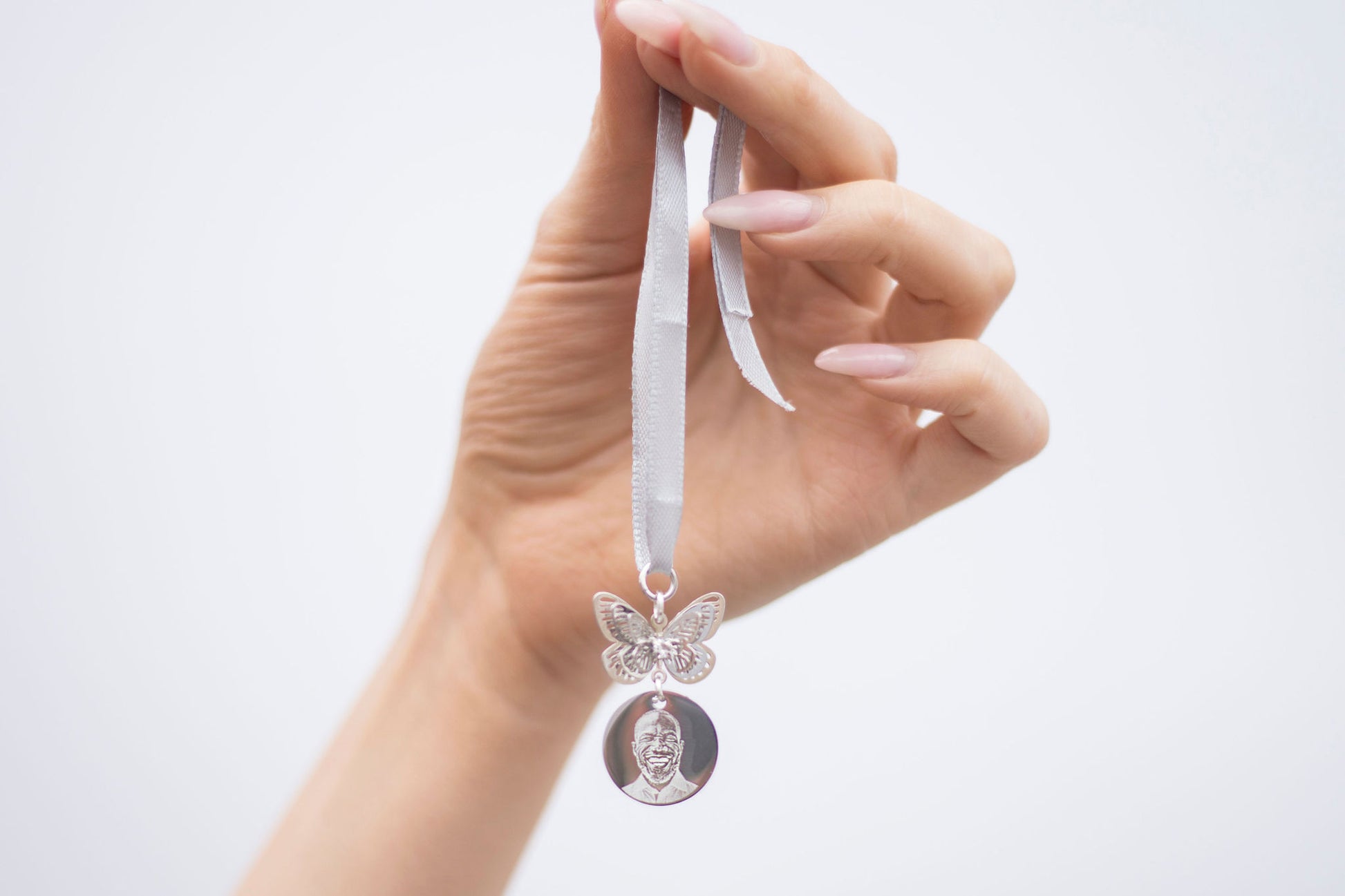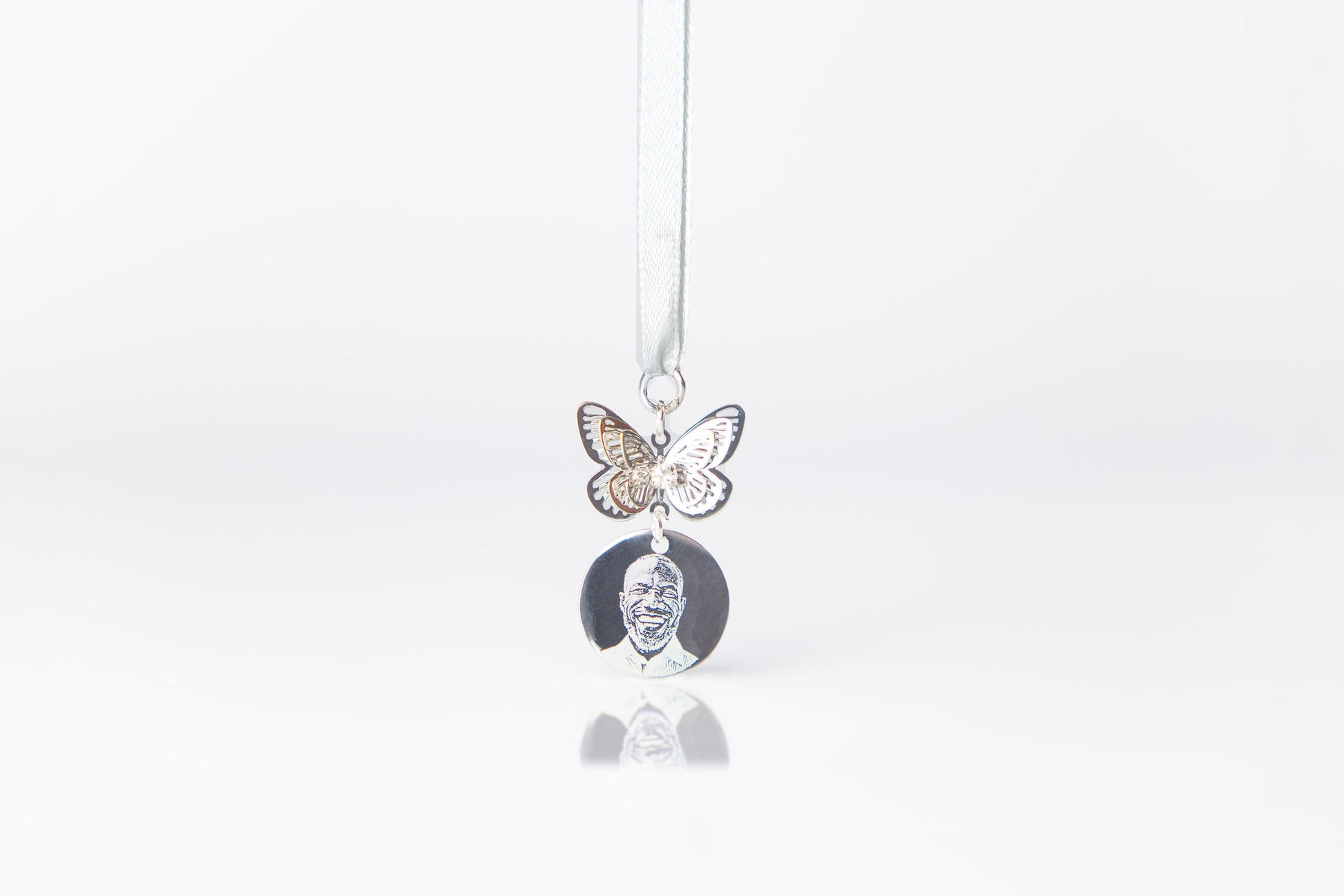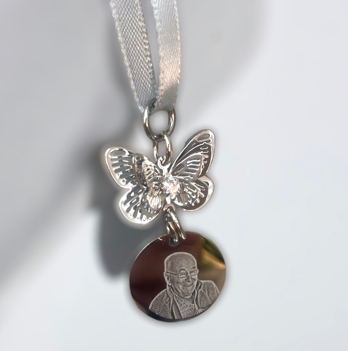 A beautiful butterfly wedding bouquet charm with a photo engraved pendant attached. This will add such a special touch to a wedding day, the ribbon ties around the flower bouquet.