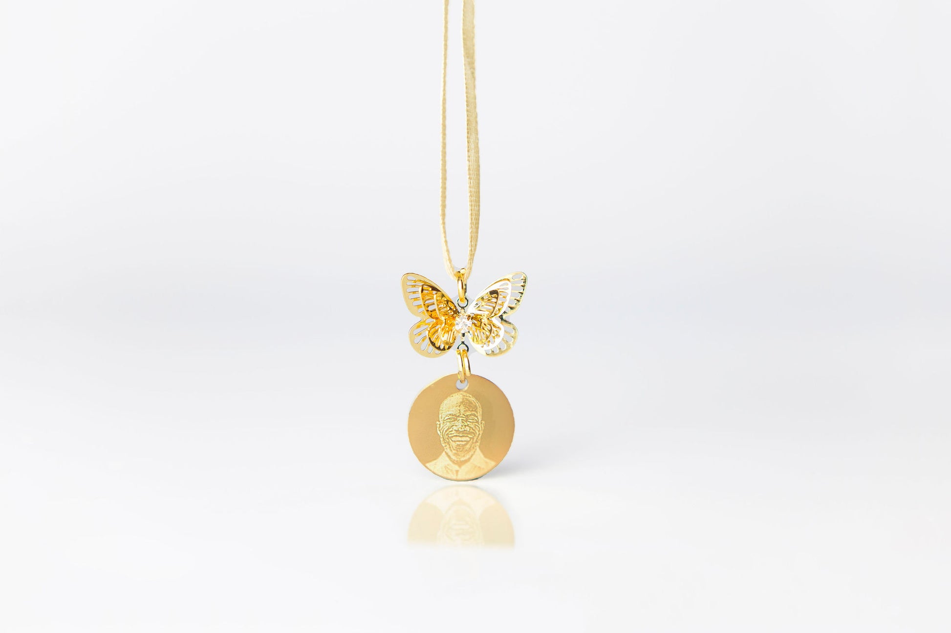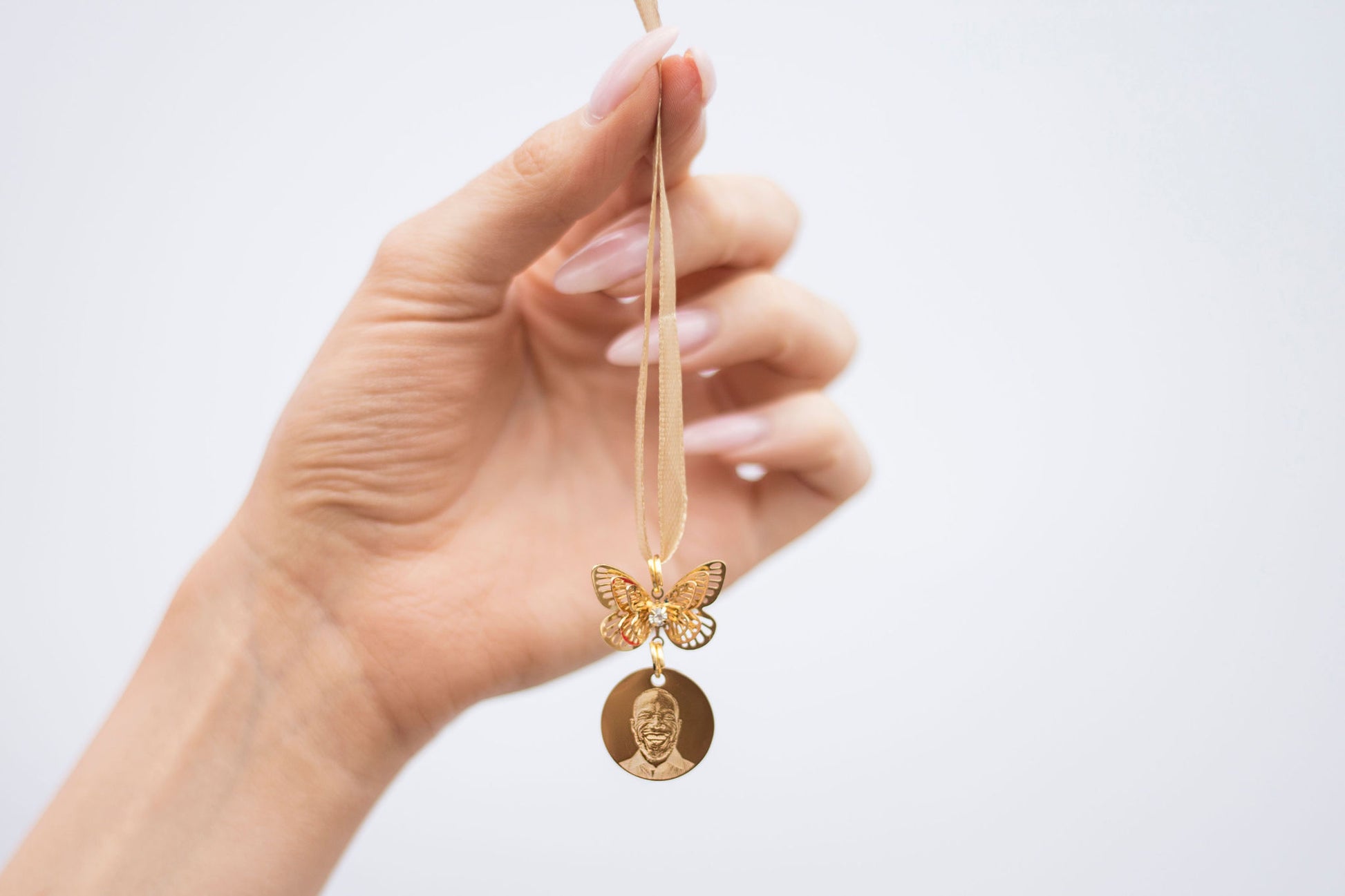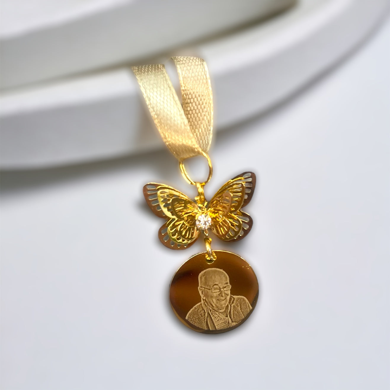 A beautiful butterfly wedding bouquet charm with a photo engraved pendant attached. This will add such a special touch to a wedding day, the ribbon ties around the flower bouquet.