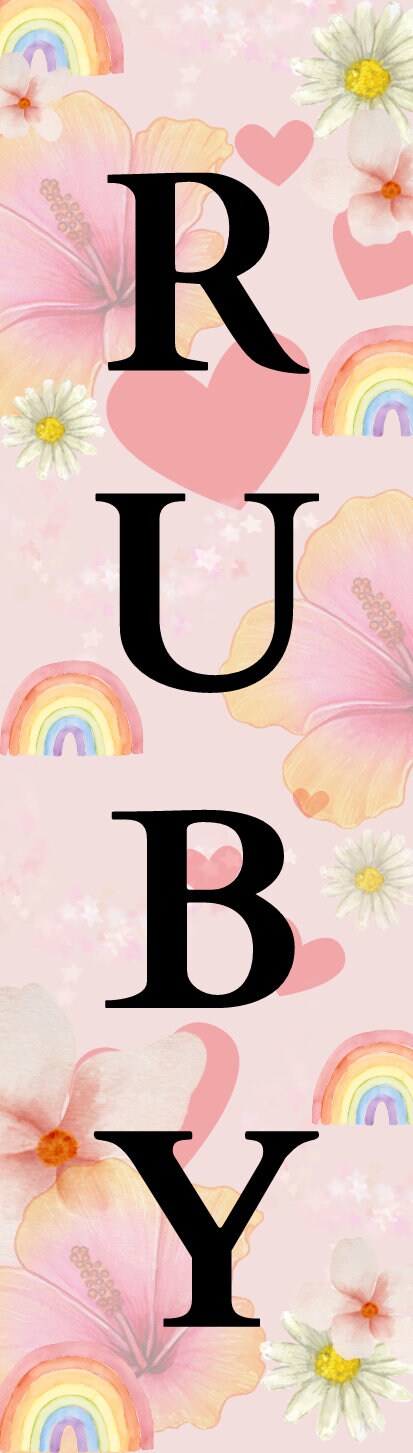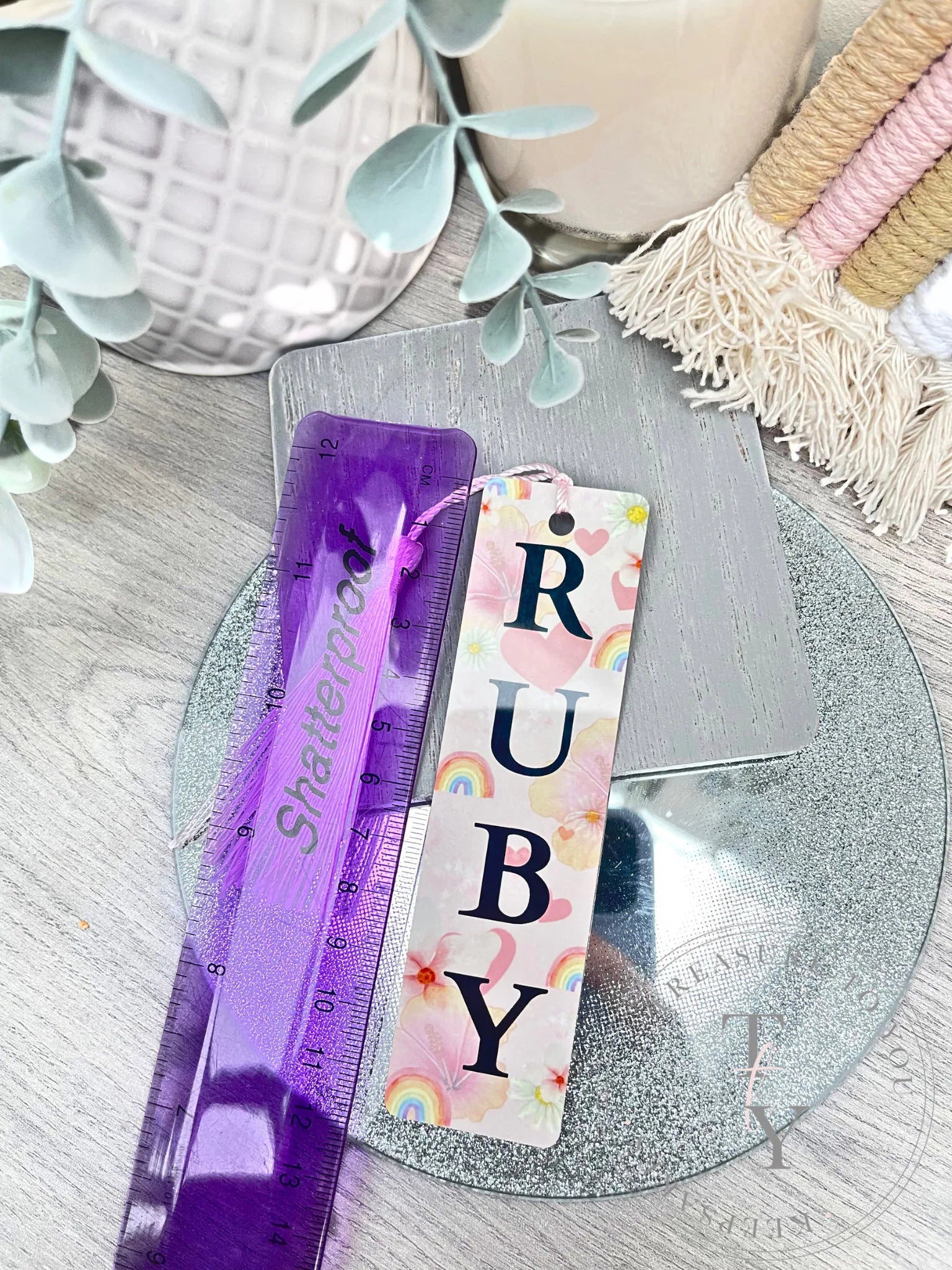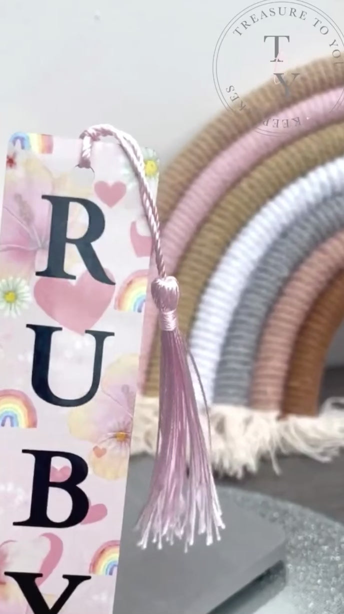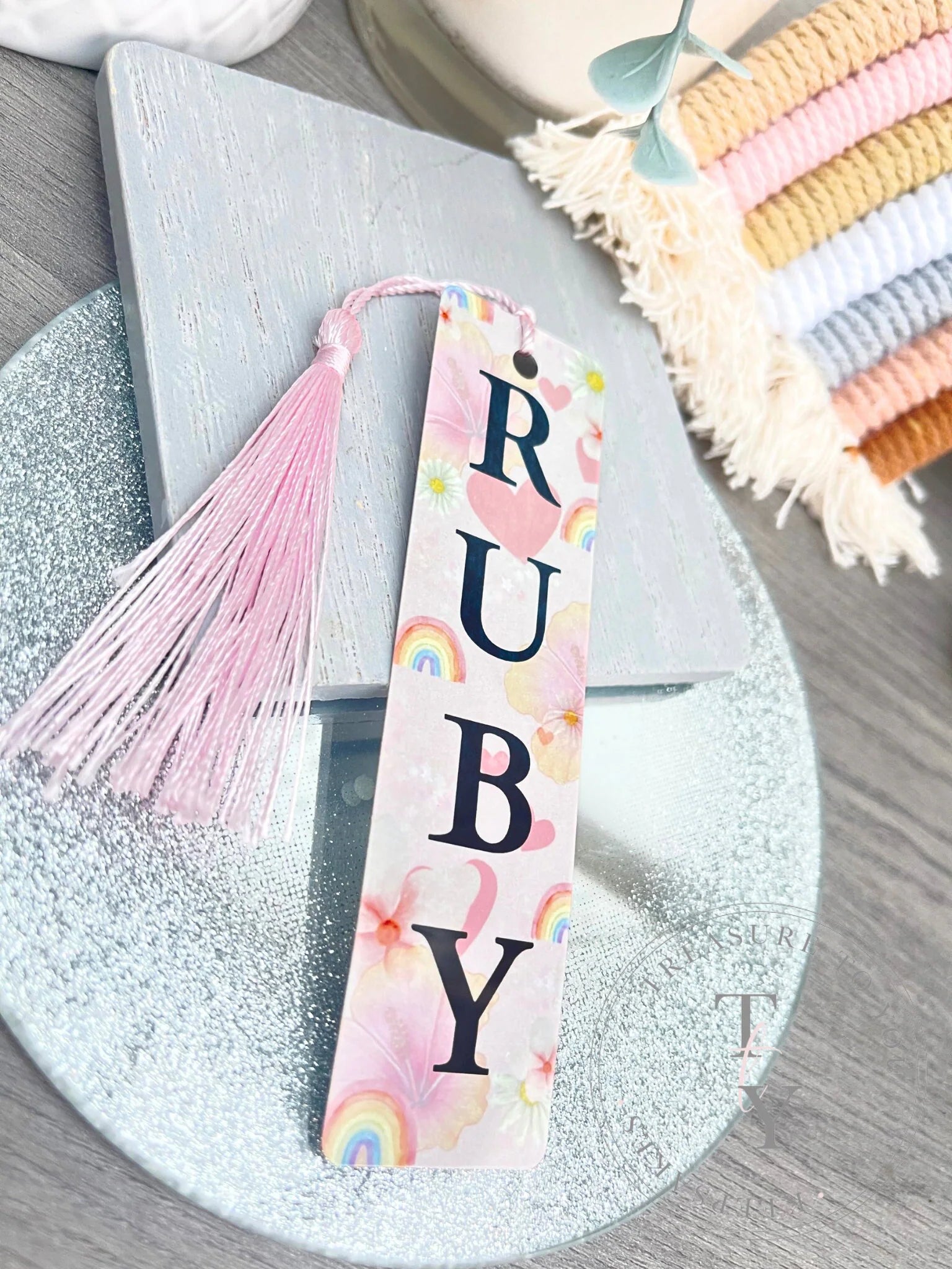 A baby pink, bookmark featuring flowers, rainbows, hearts, stars, personalised with a name.