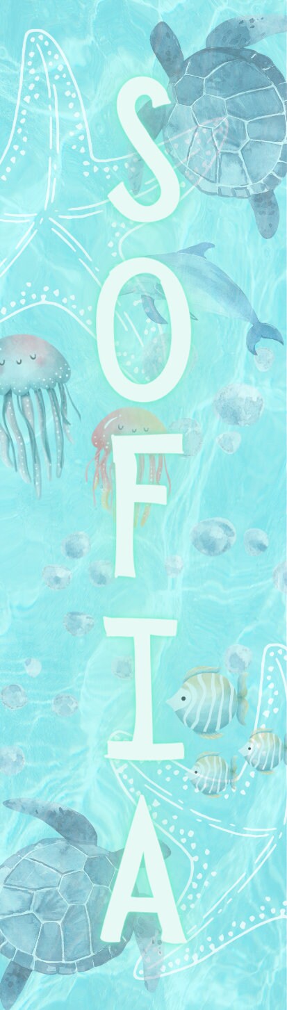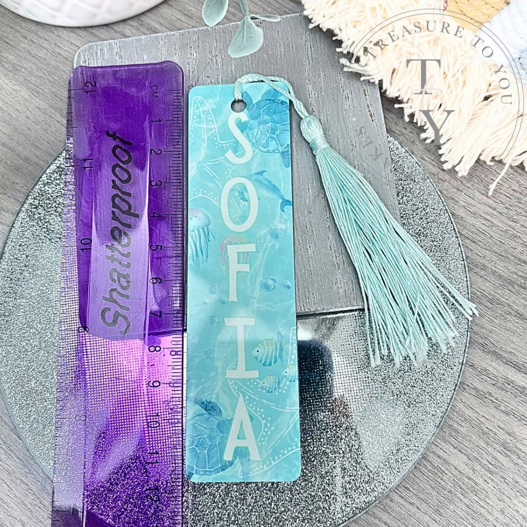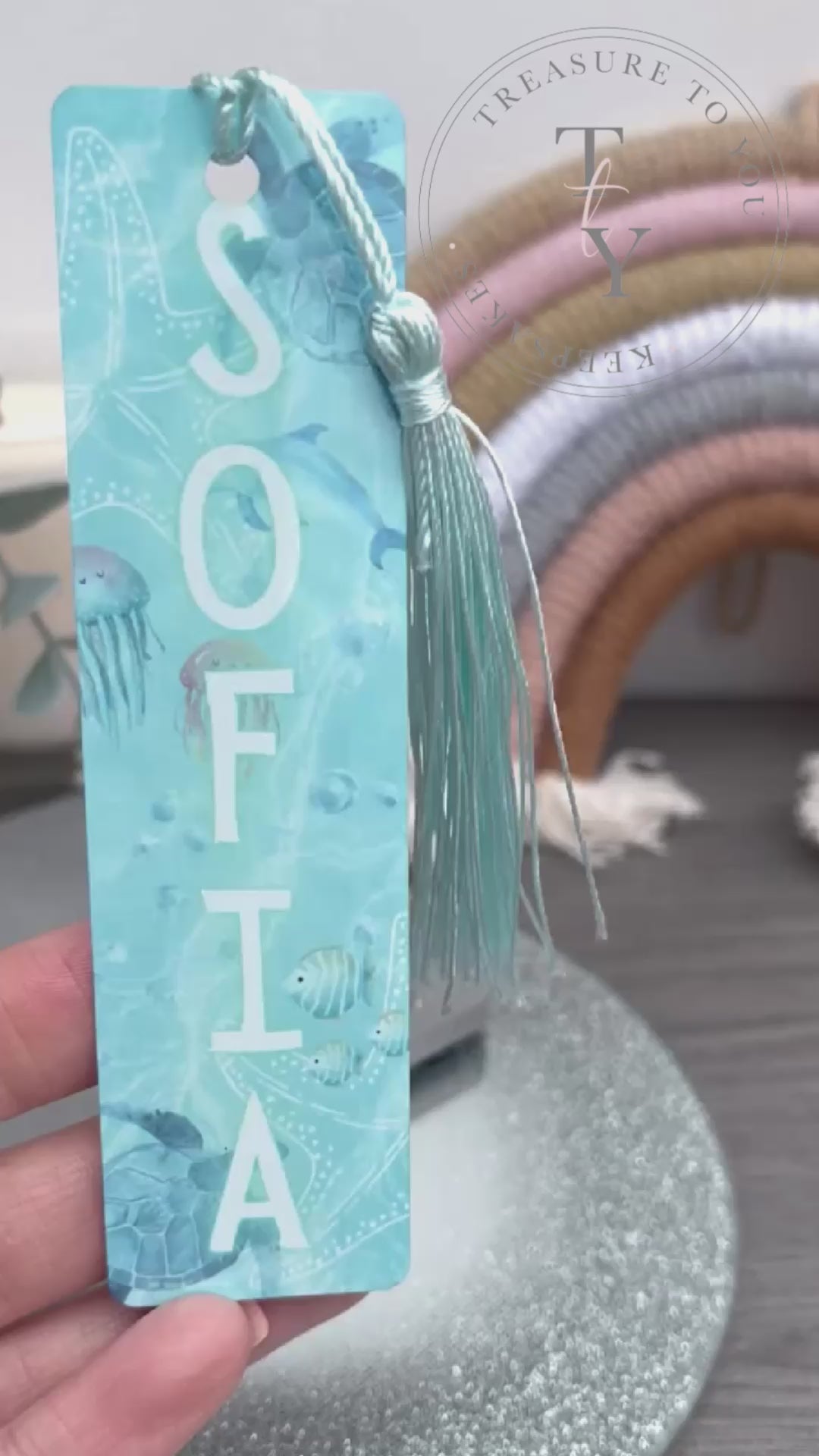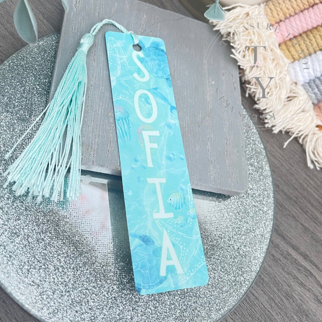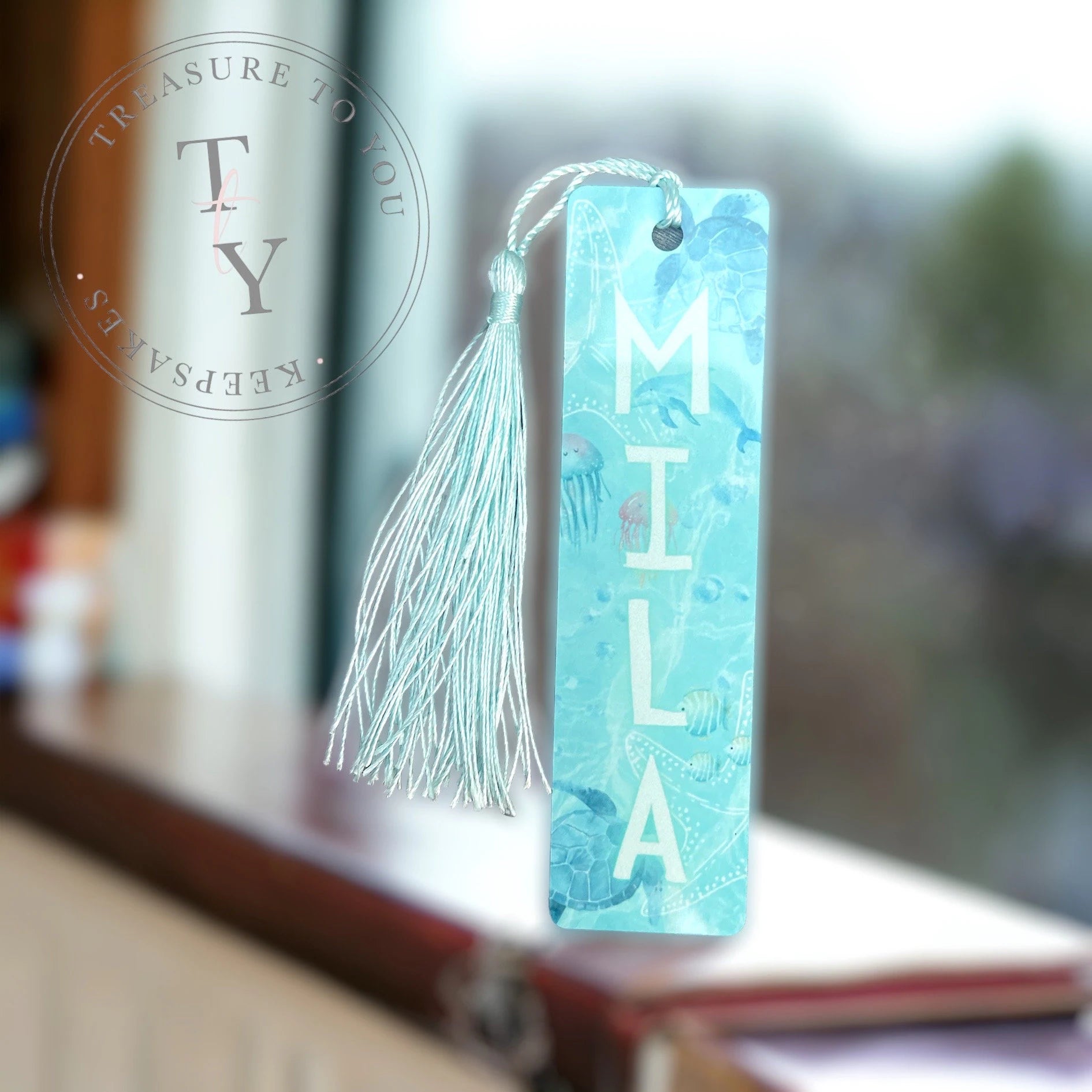 A beautiful ocean inspired under the water bookmark, personalised with a name. Aqua blue colour with a matching colour tassel.