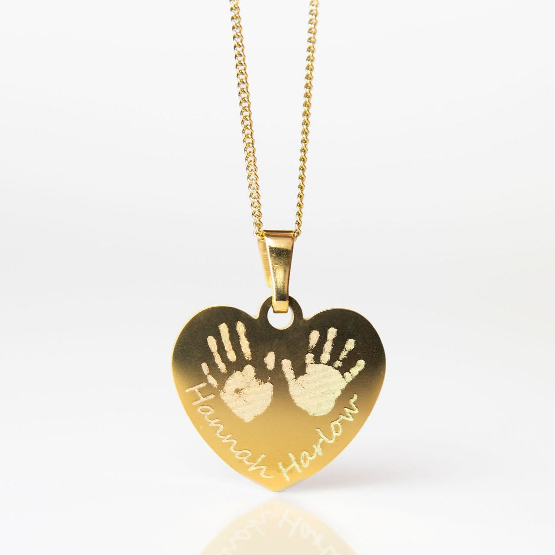 Our elegant gold sibling handprint necklace is a favored selection among customers.