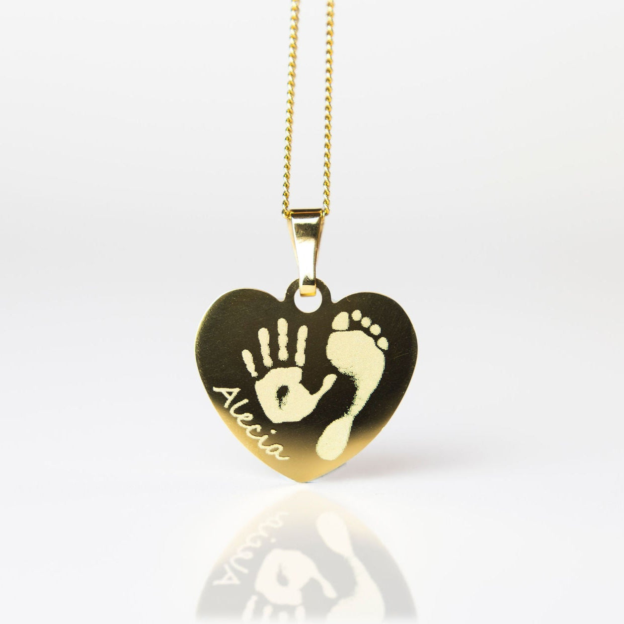 A beautiful gold heart-shaped pendant featuring engraved prints to cherish for a lifetime. Personalised text can be etched on the reverse side. Crafted from high-quality, anti-tarnish stainless steel. Dimensions: 27mm x 25mm x 2mm.