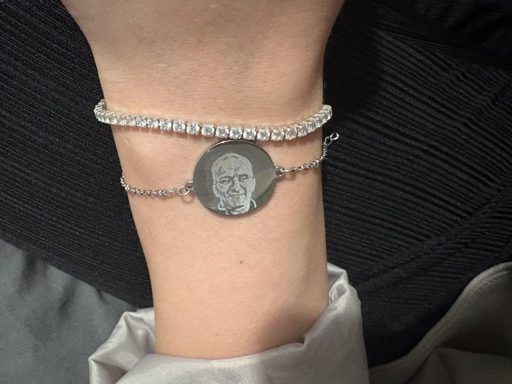 These elegant photo-engraved bracelets can be customized with your cherished images, handprints, or handwriting. The model features the Standard size. Crafted from high-quality stainless steel, they resist discoloration, are safe to wear in water, and are nickel-free. Designed to be anti-tarnish, water-resistant, and hypoallergenic, these bracelets combine durability with comfort.