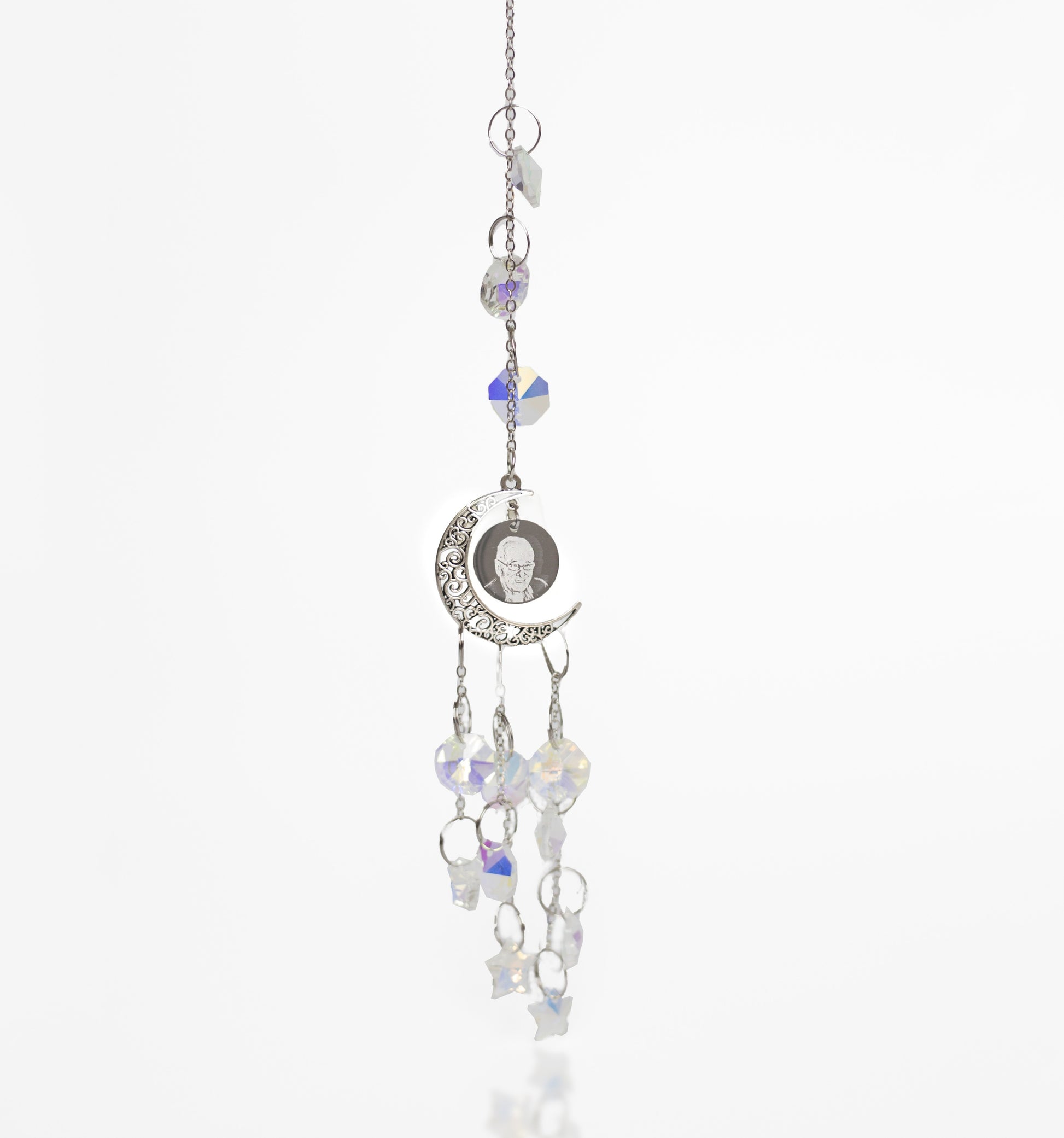 This exquisite suncatcher combines celestial design with personalised photo engraving, creating a meaningful decorative piece. The carefully selected gemstones refract light into captivating prismatic displays, casting enchanting patterns throughout your space. Measuring 38cm in length, it offers an ideal proportion for windows and interior displays. The photo-engraved pendant serves as both an artistic focal point and a cherished keepsake, making it a sophisticated choice for those seeking functional beauty with sentimental value.