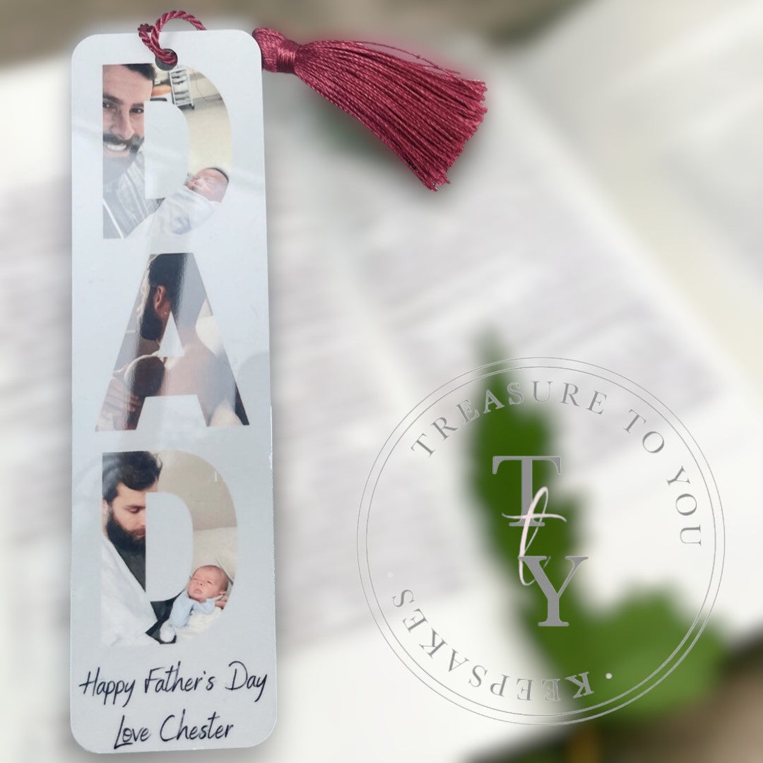 Our beautiful Father’s Day inspired bookmarks have a stainless steel backing and beautiful dark red tassle. The front is printed with 3 images of your choice in a DAD design with a personalised message on the bottom 😊