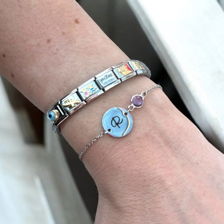 Customise your own birthstone bracelet with a small personalization, such as an initial, age, or date. Crafted from stainless steel, our bracelets are water-resistant and durable.