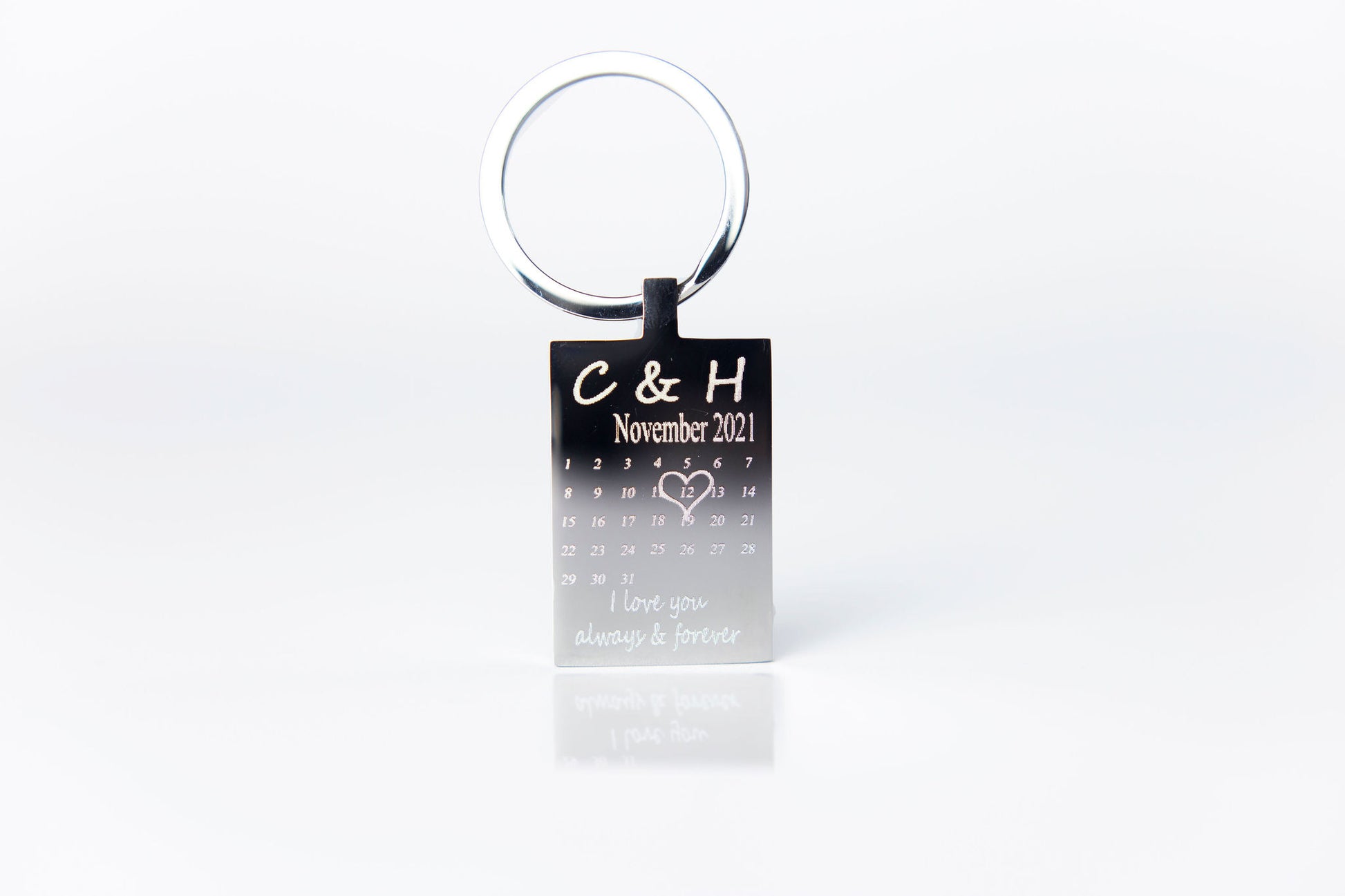 Our best selling stainless steel keyrings now in a calendar design personalised with your details & your chosen photo engraved onto the back.